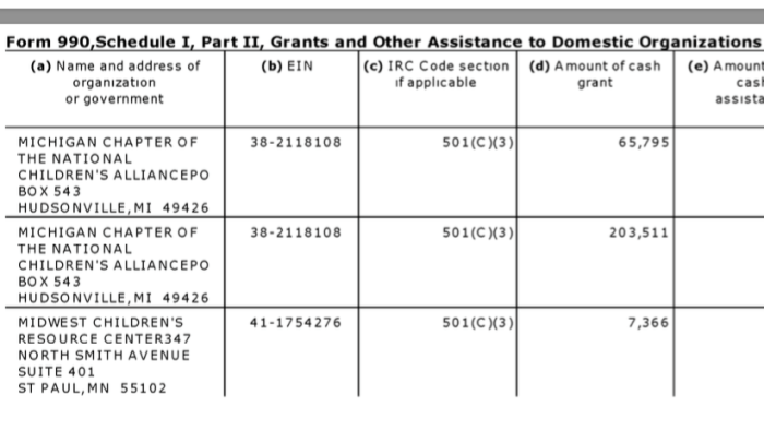 For example, National Children’s Alliance, Alabama-based (legal domicile) and its network of CACs and Statewide CAC Coalitions (FY2014 Grantees) [Published Jan. 2, 2018]. » 30 NCA EIN#631044781 (1992ff) FY2014 SCHED I GRANTEES (presented 3-UP by 990-filer, Arrggh!)~ Viewed 2018Jan02Tue @12.22.31 PM