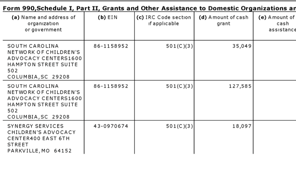 For example, National Children’s Alliance, Alabama-based (legal domicile) and its network of CACs and Statewide CAC Coalitions (FY2014 Grantees) [Published Jan. 2, 2018]. » 38 NCA EIN#631044781 (1992ff) FY2014 SCHED I GRANTEES (presented 3-UP by 990-filer, Arrggh!)~ Viewed 2018Jan02Tue @12.29.48 PM