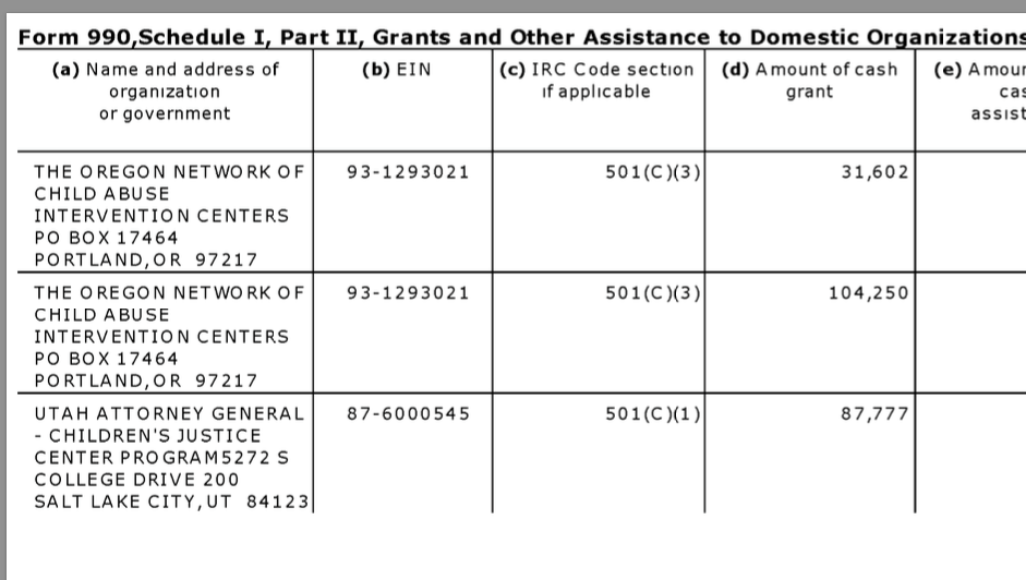 For example, National Children’s Alliance, Alabama-based (legal domicile) and its network of CACs and Statewide CAC Coalitions (FY2014 Grantees) [Published Jan. 2, 2018]. » 43 NCA EIN#631044781 (1992ff) FY2014 SCHED I GRANTEES (presented 3-UP by 990-filer, Arrggh!)~ Viewed 2018Jan02Tue @12.30.56 PM