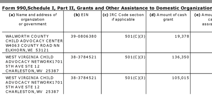 For example, National Children’s Alliance, Alabama-based (legal domicile) and its network of CACs and Statewide CAC Coalitions (FY2014 Grantees) [Published Jan. 2, 2018]. » 45 NCA EIN#631044781 (1992ff) FY2014 SCHED I GRANTEES (presented 3-UP by 990-filer, Arrggh!)~ Viewed 2018Jan02Tue @12.31.15 PM