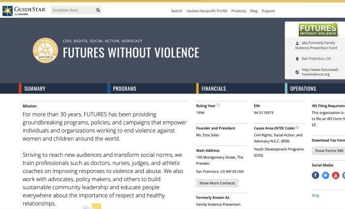 GUIDESTAR Futures w|o Violence Profile ~~Major source of funding is “government grants” (per its Forms 990) ~Screen Shot 2020-07-29. Guidestar shows its nine-digit “EIN#” (Employee Identification Number) to the right: #94311093, good to know for other database lookups…