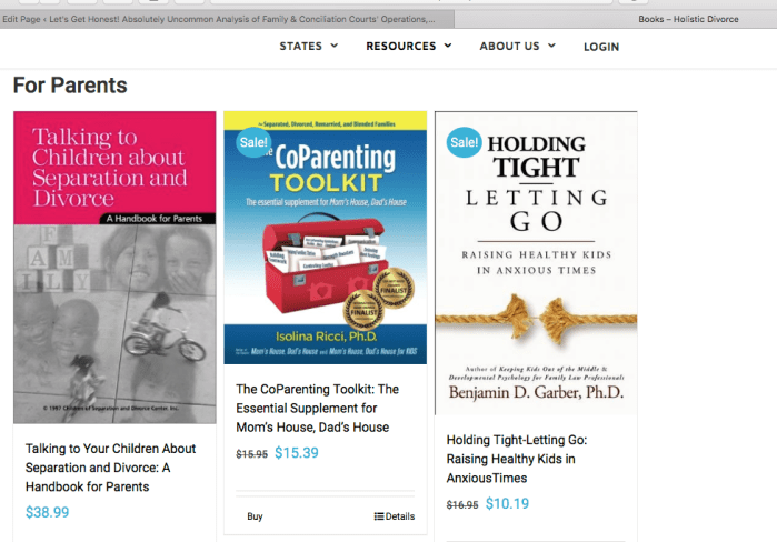Holistic Divorce.com . On the left is a book by (in entity former name) Risa J. Garon in MD; the nonprofit (she founded, earlier) is now called “Nat’l Family Resiliency Center, Inc.”). Middle=Ricci’s Co-Parenting Toolkit, right = Benjamin Garber (Searchable on this blog, or in general), activist along the same general lines…This is what AFCC MEMBERS DO, year after year, in addition to whatever law, evaluation, mediation, etc., practices they may also have. Group loyalty, imho, borders on that of a cult. Outsiders are OK to be USED for cult purposes, and acquiring more money and more ways to acquire it while promising benefits, is a constant key theme of many cults. Membership may be from all levels of society, but may not be openly revealed when interacting in public. etc.