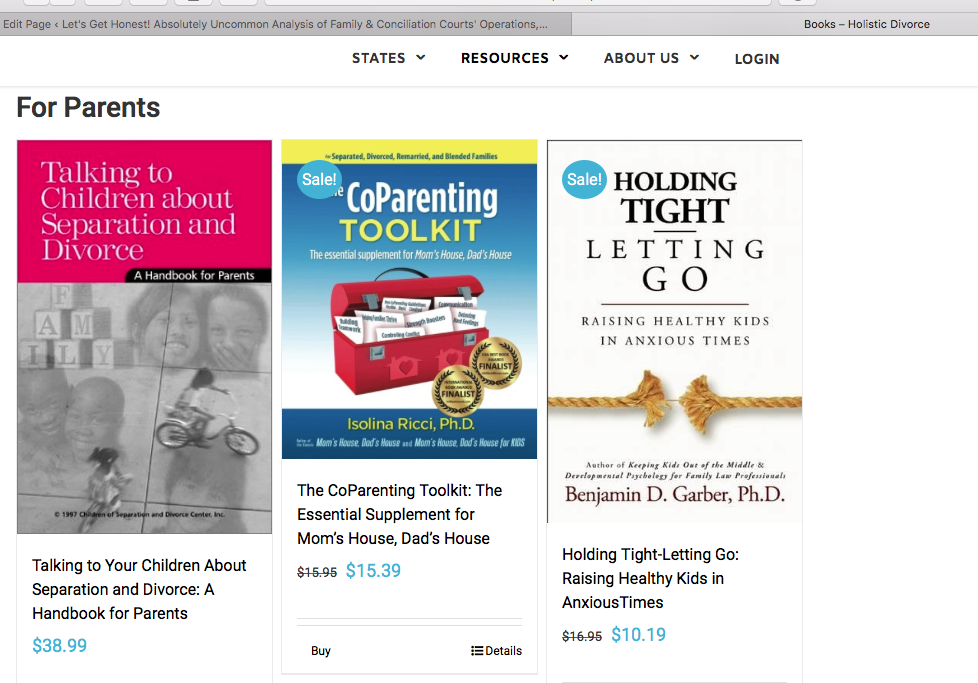 Holistic Divorce.com . On the left is a book by (in entity former name) Risa J. Garon in MD; the nonprofit (she founded, earlier) is now called “Nat’l Family Resiliency Center, Inc.”). Middle=Ricci’s Co-Parenting Toolkit, right = Benjamin Garber (Searchable on this blog, or in general), activist along the same general lines…This is what AFCC MEMBERS DO, year after year, in addition to whatever law, evaluation, mediation, etc., practices they may also have. Group loyalty, imho, borders on that of a cult. Outsiders are OK to be USED for cult purposes, and acquiring more money and more ways to acquire it while promising benefits, is a constant key theme of many cults. Membership may be from all levels of society, but may not be openly revealed when interacting in public. etc.