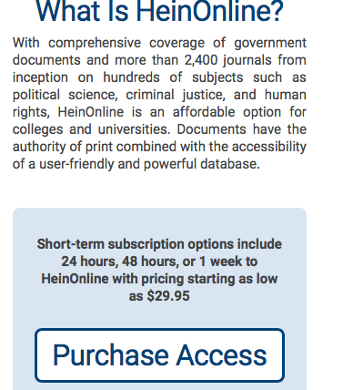 “HeinOnLine is an affordable option for colleges and universities.” Not, often, for individuals, although the publications are often deliberations on matters that affect the masses (the population) deeply, and having this information timely might help us protect our own best interests, or contribute, even absent the designation “professional” (JD, PhD, etc.) or being attached somehow to a university, to such conversations..