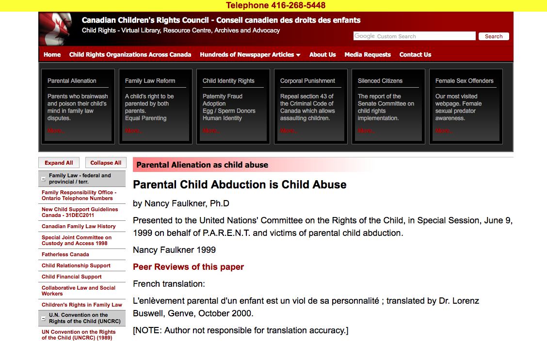 Canadian Website on Children’s Rights quoting Faulkner Article (underneath “Parental Alienation is Child Abuse” and showing where the article was first delivered