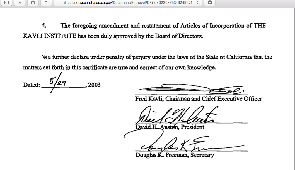 The Kavli Institute (2003, signature page as found on Calif. SOS Bus. Entity Search site, viewed Oct. 14, 2019)