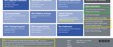 AFCC is the Association of Family and Conciliation Courts – the premier interdisciplinary and international association of professionals dedicated to the resolution of family conflict. AFCC members are the leading practitioners, researchers, educators and policymakers in the family court arena. © 2017 Association of Family and Conciliation Courts.