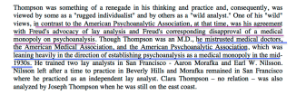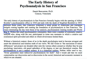 So above, when I made that verbal “crack” about Scientology and the same practices, I thought of this interesting “factoid” on early influences by psychoanalyst on the founder of a well-known cult, or religion, depending on one’s point of view…It also talks about the tension between restricting the practices of psychoganalysis to medical professionals, vs. “lay,” which term alone ought to also clue us in that this is closer to religion than science, although I dare you to say that to the face of a practitioner!