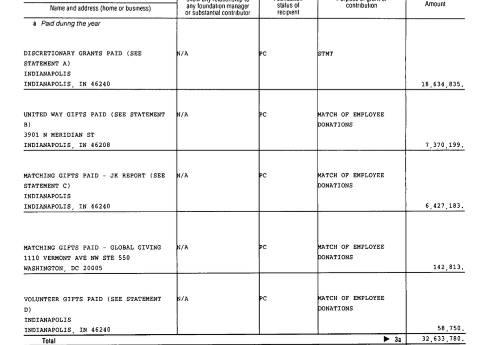 Grants Summary Page, Eli Lilly + Company Fndtn (EIN#35-6202479, NOT the Lilly Endowmt) FY2015 990PF excerpts (here, there are detailed statemt pages later).