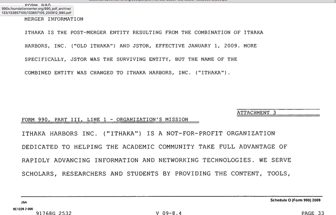 State-by-State Charity Lookup Links (from SimpleCharityRegistration.com’s March 2017 WordPress post). [Published 11/11/2017]. » ITHAKA HARBORS (fka JSTOR) EIN#13-3857105, FY2009 (merger year), Various Excerpts SShot 2017Nov10 FRI @7.39.40 PM