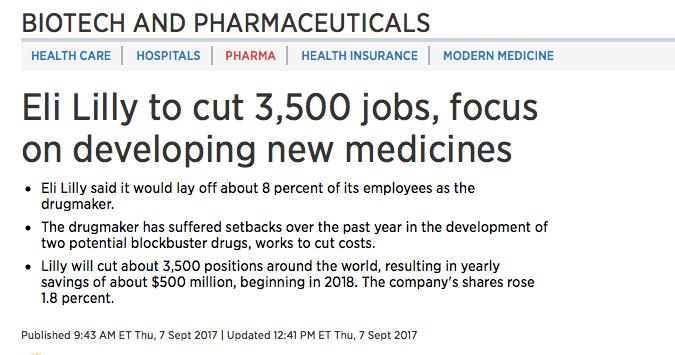 Click image to enlarge or HERE for the Sept. 9, 2017, article at CNBC.com: “The company expects most of the cuts to come from a voluntary early-retirement program it is offering in the United States. It is also closing a plant in Iowa and research and development offices in New Jersey and China…. shares rose $1.46 to $81.97 in afternoon trading.”