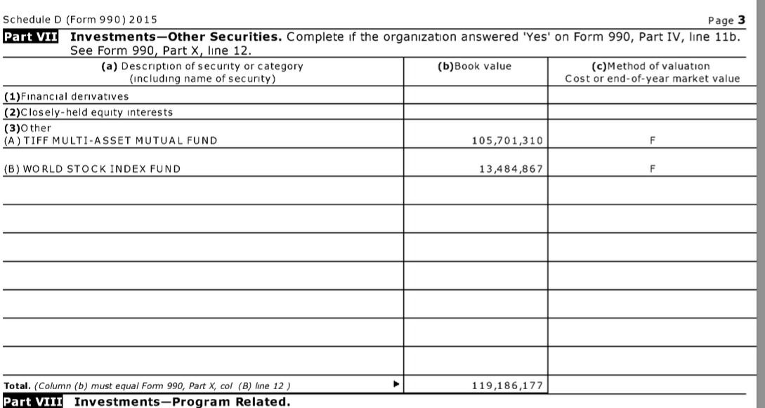 Ithaka Harbors (formerly “JSTOR”), EIN#13-3857105 Supplemental Info, showing where its $119M of “Investments-Other” are being held..