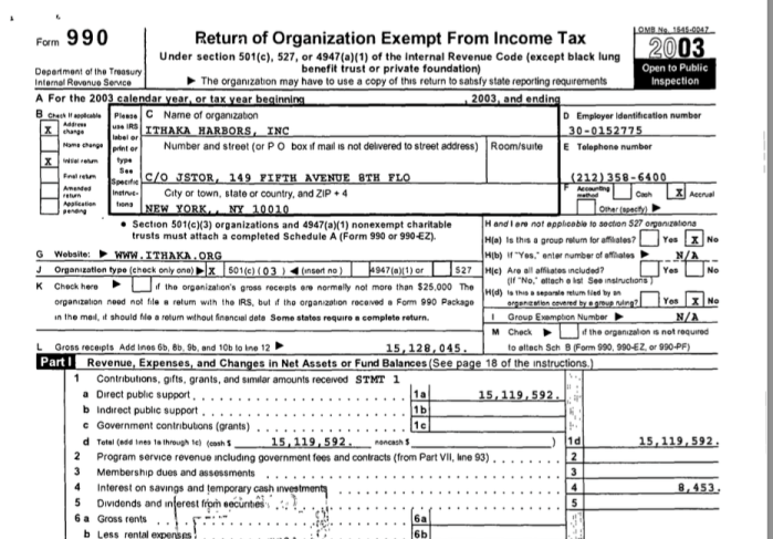 Ithaka Harbors (as EIN#30-0152775) FY2003 (Initial Form 990) showing address “℅ JSTOR” and about $15M gross receipts…