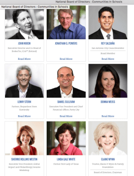 Communities In Schools, Inc. (national) board of directors each has a bio blurb. Out of 24 total (incl. former Educ. Secretary under Pres. Obama, Arne Duncan; above three images), here are the six women so privileged in slideshow format (some bios may take two — Chairman Elaine Wynn’s takes three — images):