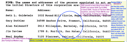 CAFI 1993-04 Founding Dox (1st directors all men from SFBayArea) from CalCharTr Registry and, EIN#680328915, CAFI (ChildAbuseForensicInstitute) a CJC-approved CE provider? REALLY? See CharDetails viewed Mar2017) works alongside ChildAbuseSolutns Inc (BK)