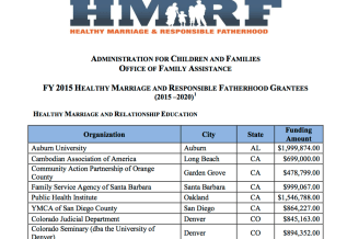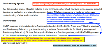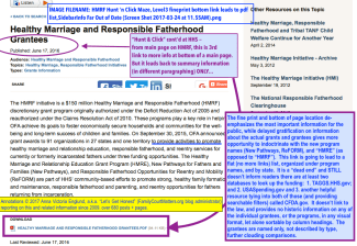 HMRF Hunt ‘n Click Maze, Level3 fineprint bottom link leads to pdf list,SidebarInfo Far Out of Date (Screen Shot 2017-03-24 at 11.55AM) (4) (HHS “download” link to the grantees list is “end of the line” for information on that Hunt’n Click trail. Going any further would be up to the reader — HHS is not about to help the readers, either see or evaluate these programs or grantees in any further detail. Apparently this is on a “Need to Know — and Public Doesn’t Really Need to Know” basis. But what they DO need more education in is healthy marriages, fatherhood.