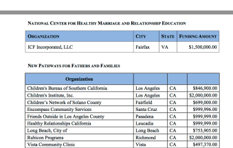 Also note (from descriptions) that this grants stream is In discretionary, and may go to nonprofits or government units, universities, etc. Some grants obviously dwarf the others in size, so HHS “discretion” must include who are the best representatives. Further lookups (I’ve done plenty over time) of a 2015 in Oklahoma City (Public Strategies, Inc.) is that it continues to be a PR firm; of “ICF Incorporated, LLC” [Bloomberg.com on that company shows size of contracts — and HHS is using public funs to give it GRANTS?] [definitely a strange entity name — “Inc.” designates one kind of corporation and typically “LLCs” another, as to the IRS filing. This one is an “…. Inc., LLC.”] (“National Resource Center”) is that it is a multi-million-dollar global for-profit business who’s built its assets primarily through government contracts, where the “ICF” originally stood for “Inner City Fund.” The National Fatherhood Initiative (as a 501©3) has also used them or one of the offices (or related entities) as an independent contractor, meaning this entity got money both directly and indirectly for this cause from the public.
