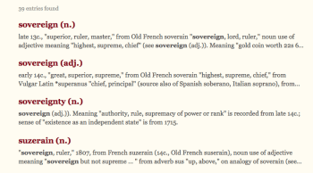The conversation (so to speak) below started on that HiAP (“HEALTH not LAW”) post with a hypothetical question I posed, and having noticed my own breezing right past the question of “sovereignty” when it came to global citizenship, I put on the brakes, looked it up in my favorite etymological dictionary. [“A map of the wheel-ruts of the English language”] and started looking for historical usages of the word. [“sovereign” in OED also includes other definitions using the word; see next two images:]